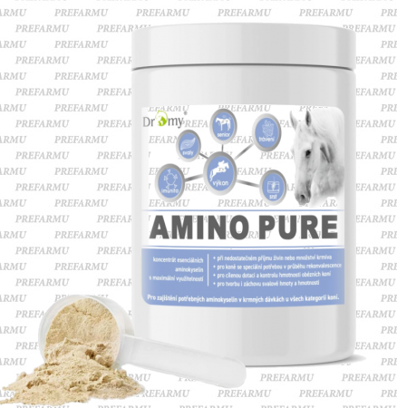 Amino PURE je sypké doplnkové krmivo s optimalizovaným profilom kľúčových čistých 7 esenciálnych aminokyselín v koncentrovanej forme a peptidov s rozvetveným reťazcom, ktoré kôň dokáže 100% vstrebať a využiť už v tenkom čreve. Je možné ho podávať súbežne akýmkoľvek krmivom, mineralizovaným krmivom a olejnatou zložkou po nevyhnutne potrebný čas aj dlhodobo. Nutrične vyvážené zloženie ponúka jednoduché a účinné riešenie ako podporiť výživu vášho koňa v náročných situáciách, s maximálnou vstrebateľnosťou a využiteľnosťou nenahraditeľných esenciálnych aminokyselín.